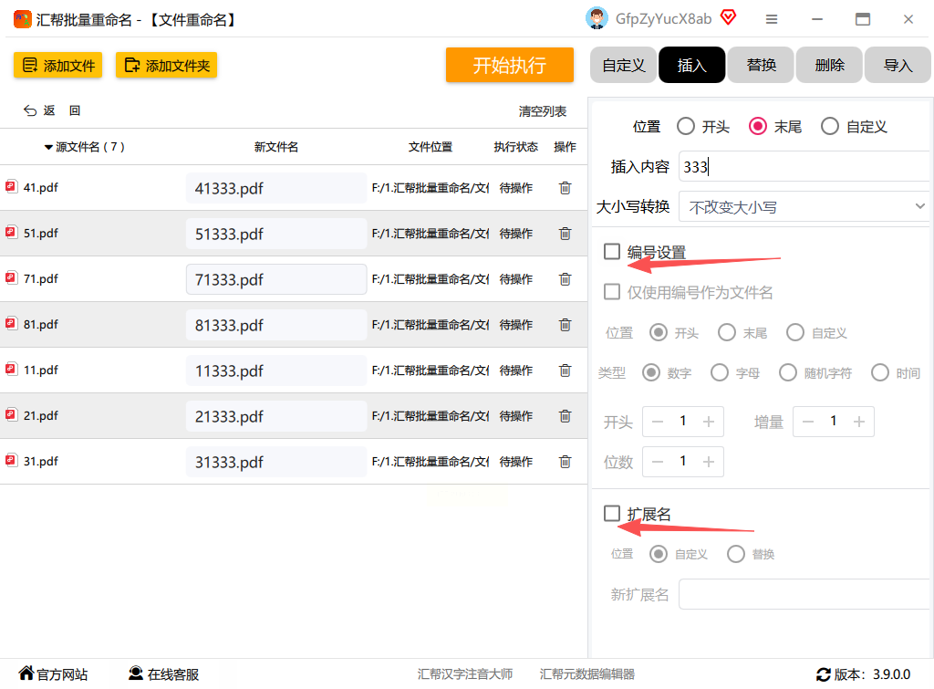 6. 如果需要为文件添加编号或保留扩展名,可以在界面中勾选相应的选项进行设置。
