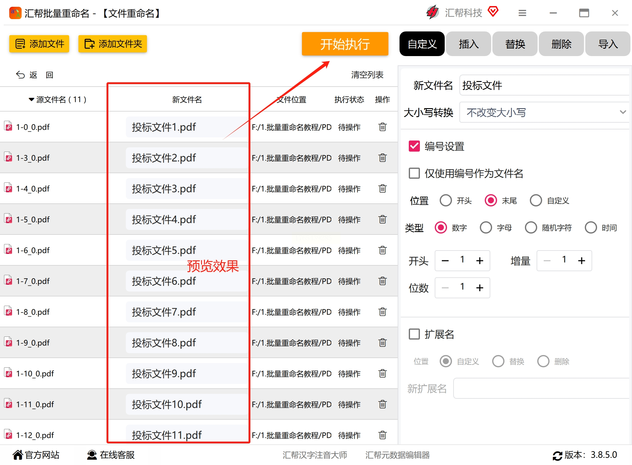 在软件右侧的设置面板中,选择“自定义”命名方式。在新文件名输入框中,可以设计命名模板,例如“文档_[N]”,其中[N]代表自动编号。点击“编号设置”按钮,可以详细配置编号的起始值、位数、增量以及位置(前缀或后缀)。此外,软件还可能支持插入日期、时间、文件属性等变量。