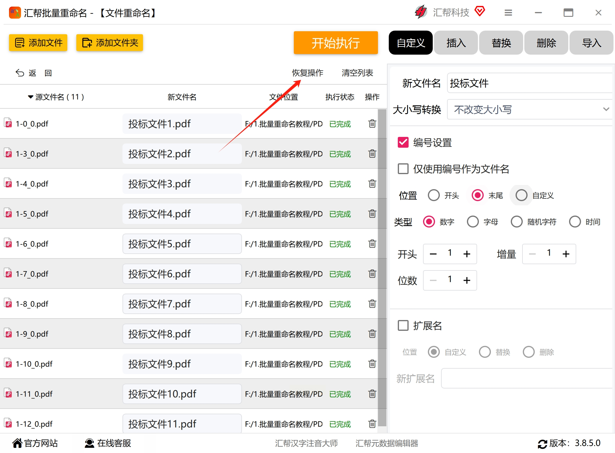 如果不满意重命名结果,大多数专业软件都提供撤销功能。在“汇帮批量重命名”中,可以找到“恢复操作”或“撤销重命名”按钮,将文件名还原到上一次操作前的状态。但需注意,这种撤销功能通常只保留最近一次操作的记录。