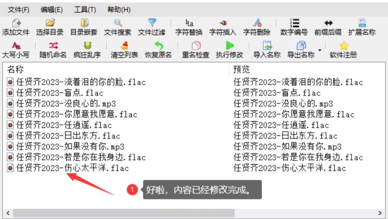 4. 预览确认不翻车:左边列表会变成改好的文件名,你扫一眼,看看有没有漏改或者改错的,没问题就点“执行修改”!软件进度条跑起来,唰唰唰全改完~