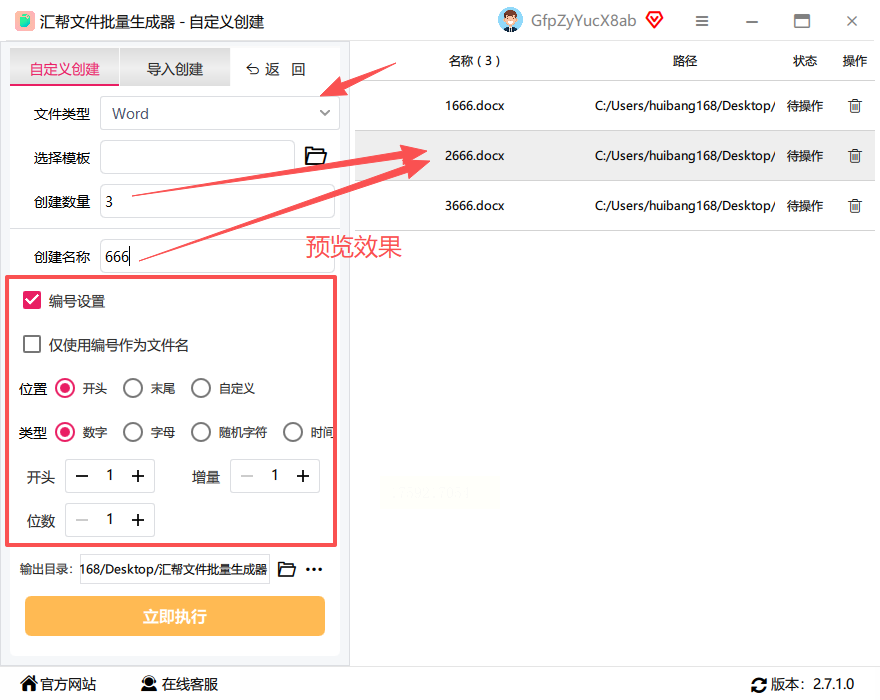 步骤二:在页面中输入需要生成的文件数量,并设置命名规则,比如“文件_1、文件_2”等序列。