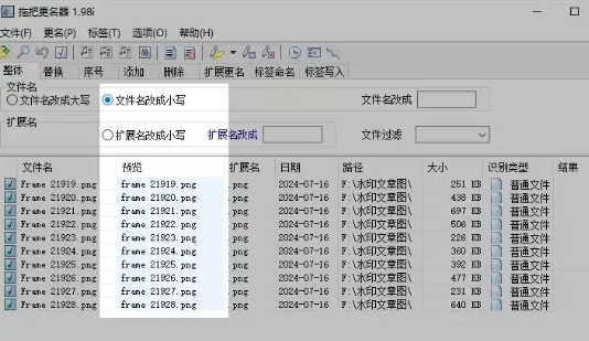 - 软件会实时预览转换效果,例如"Frame 219.JPG"会自动变为"frame 219.jpg","Data_Test.CSV"变为"data_test.csv";