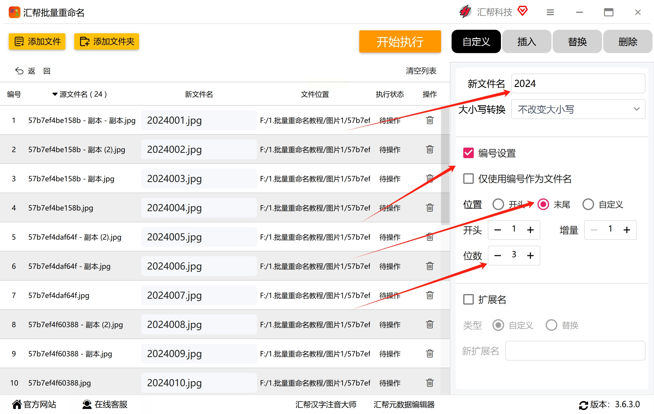 确认设置无误后,点击“开始执行”按钮。软件将自动为所有文件添加编号。完成后会提示操作成功,并可在原文件夹中查看结果。
