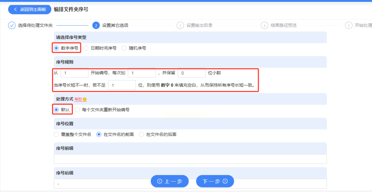 - 若需纯数字编号,勾选"仅使用编号作为文件名",设置起始编号(如1)、间隔(1)、位数(3位,如001-999)。