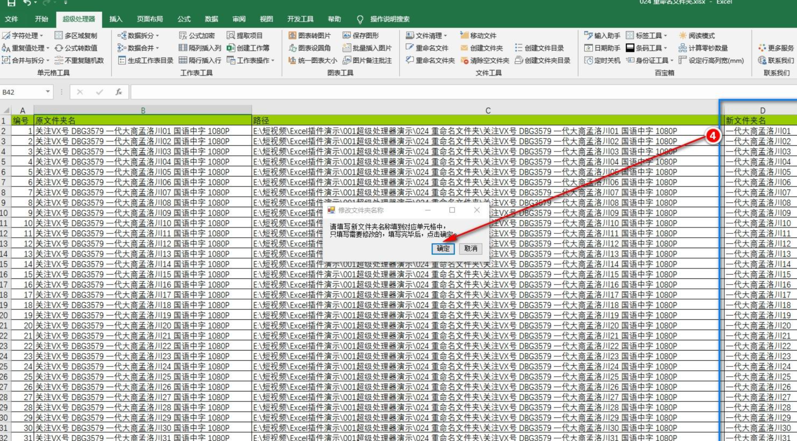 - 点击"确定",Excel会自动执行批量重命名,完成后子文件夹也会同步更新。