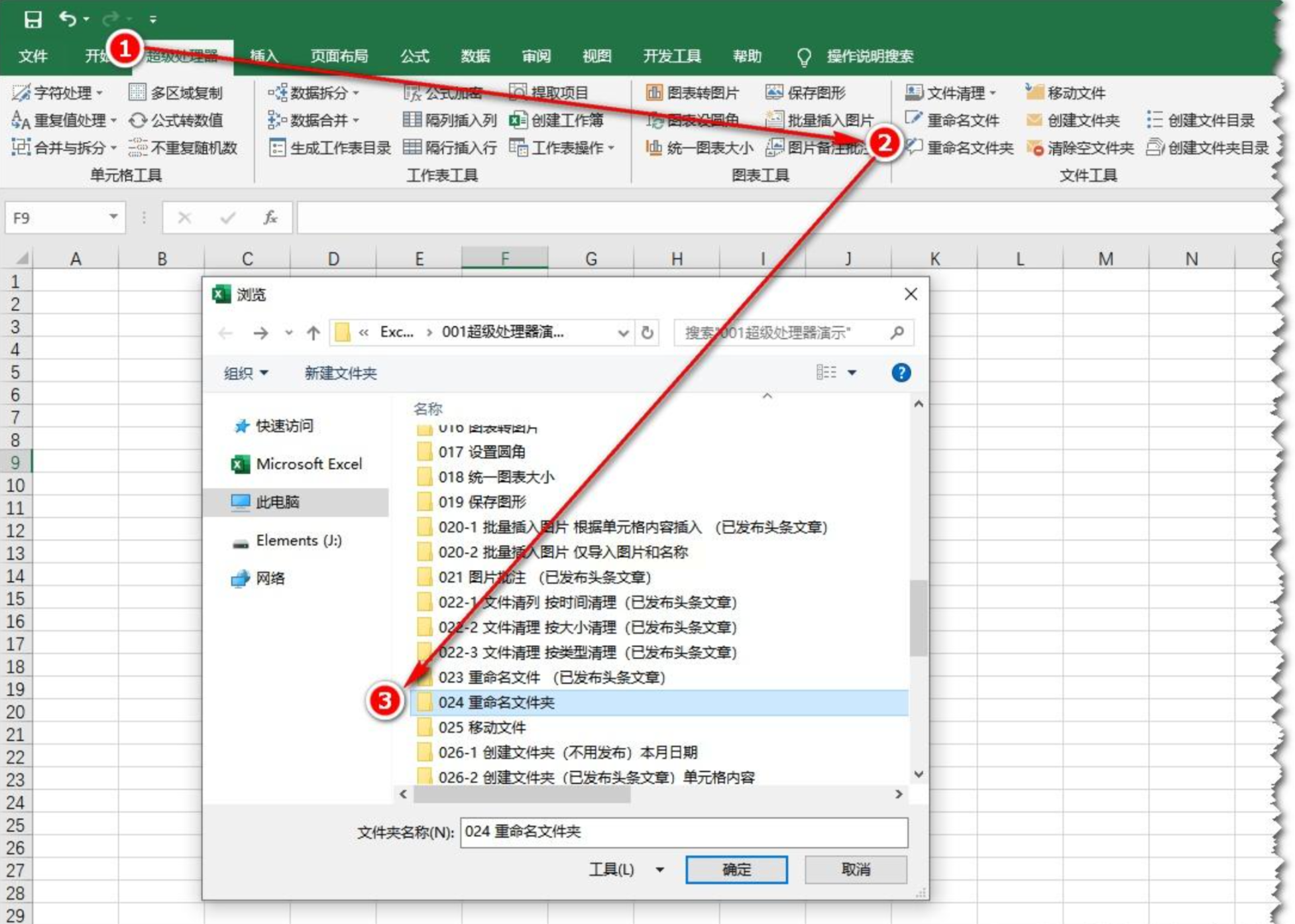 - 打开Excel,点击"超级处理器→重命名文件夹",选择待编号文件夹的路径。