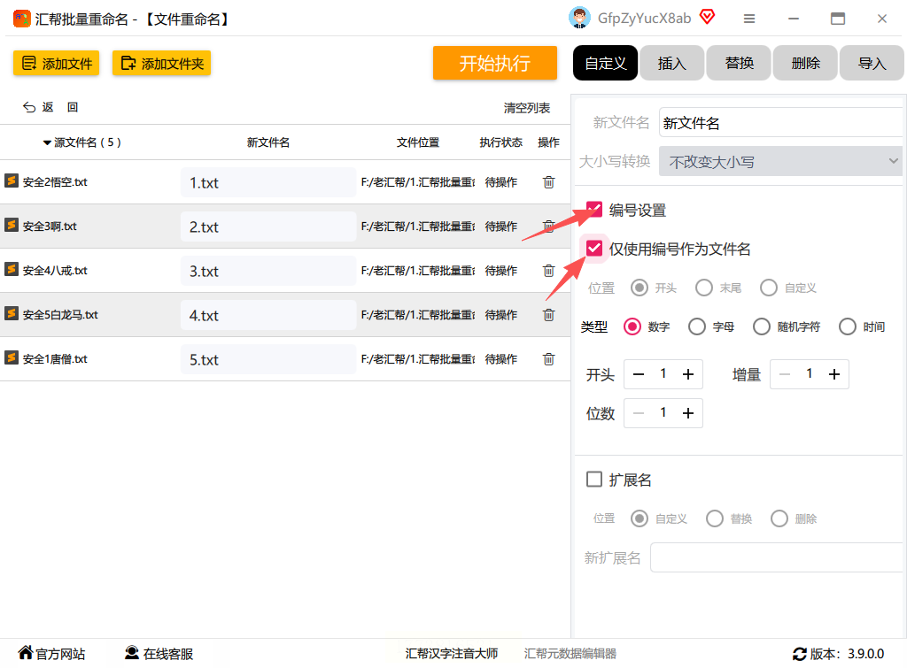 4. 勾选“编号”和“仅使用编号作为文件名”,这样文件名就只有序号了;