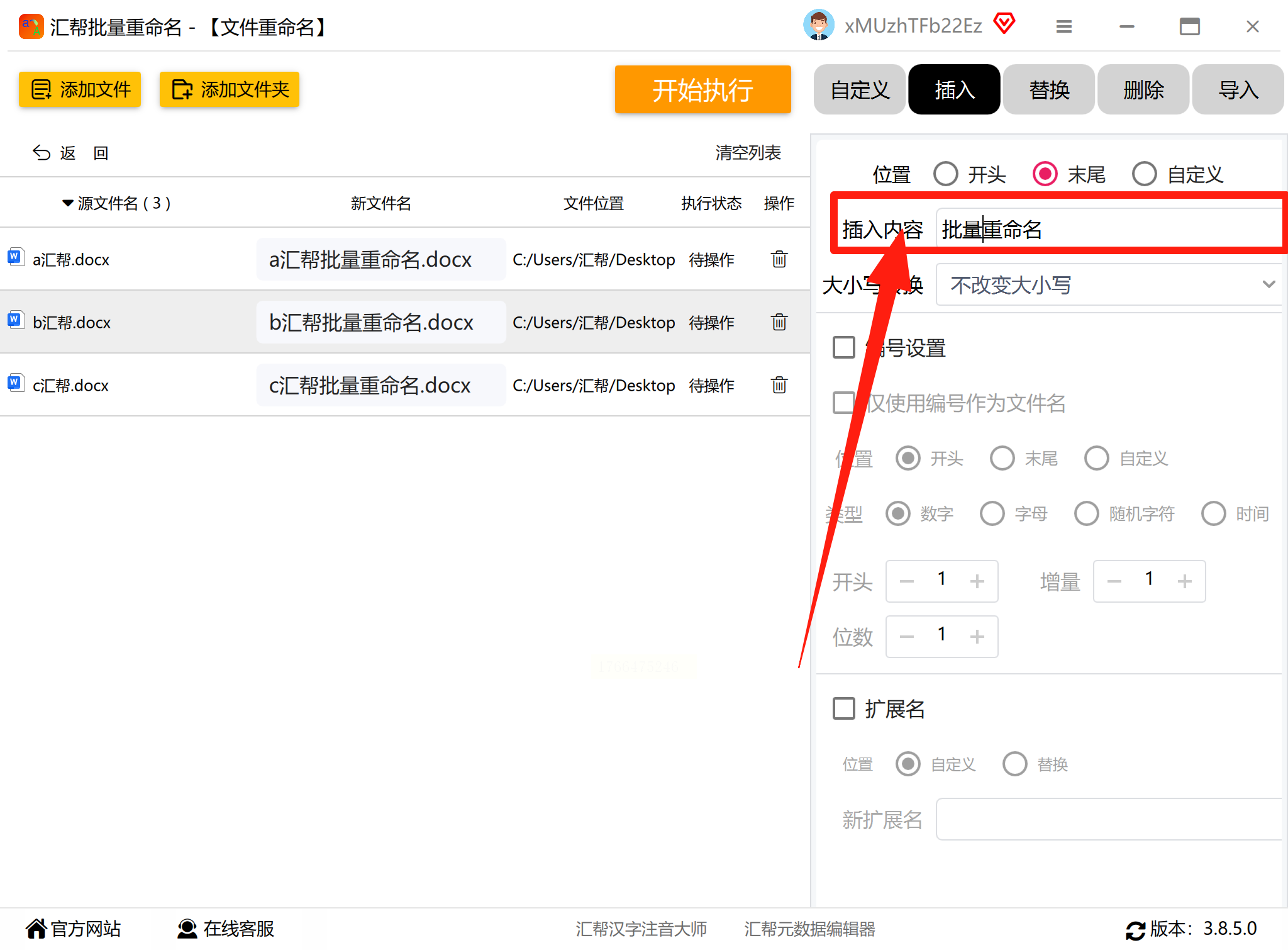 在位置选项中,明确选择“末尾”。这确保了新增内容会准确添加在原始文件名的最后方。
