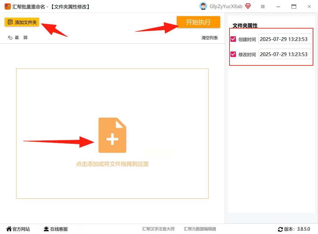 第一步:去官网下载最新版汇帮批量重命名,安装完成后打开软件,在主界面左侧功能栏找到"文件夹属性修改"选项并点击进入。