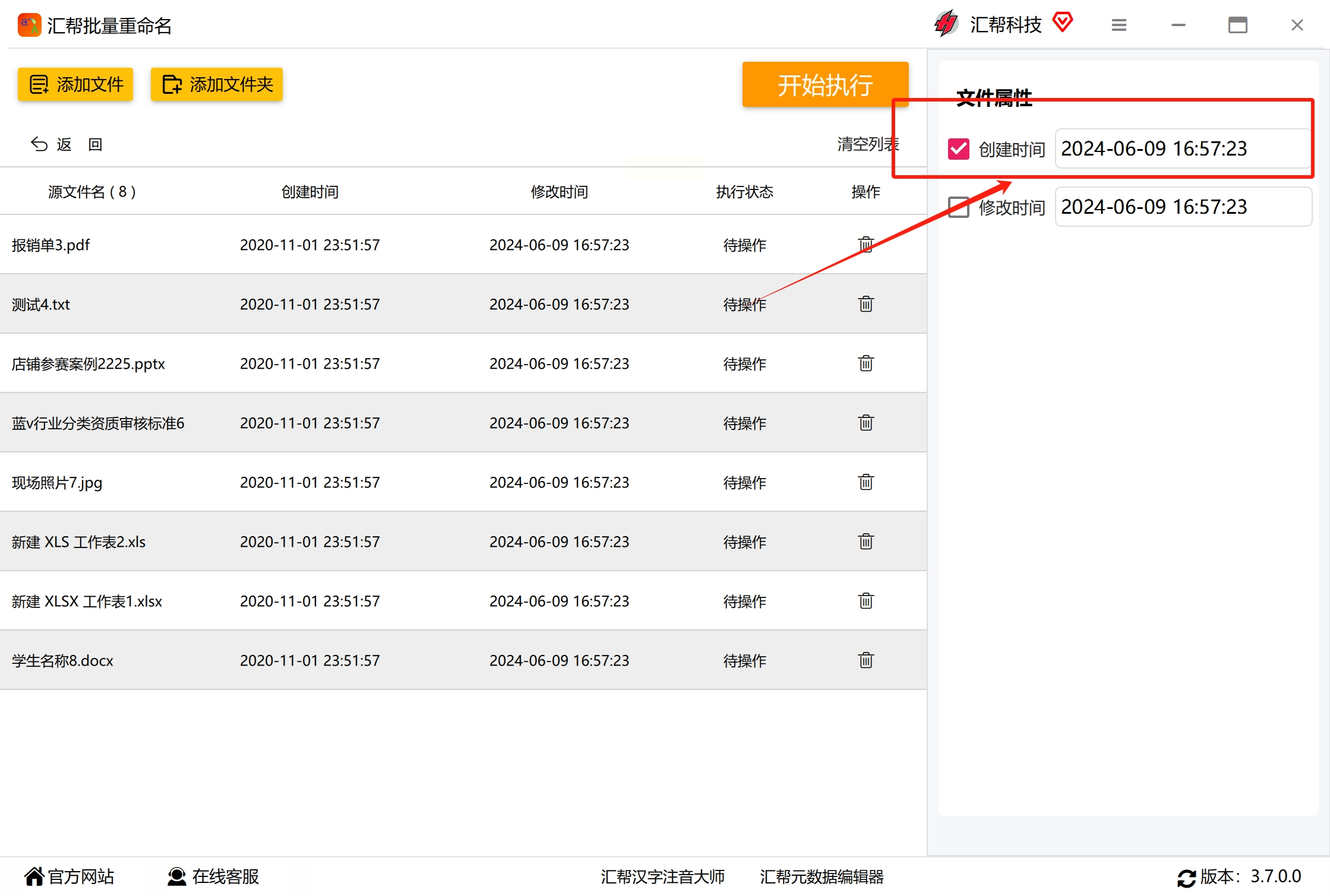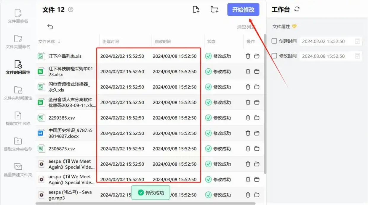 5. 执行修改:最后,点击软件界面顶部的【开始执行】,稍等片刻,所有文件的时间属性就都被改好了。