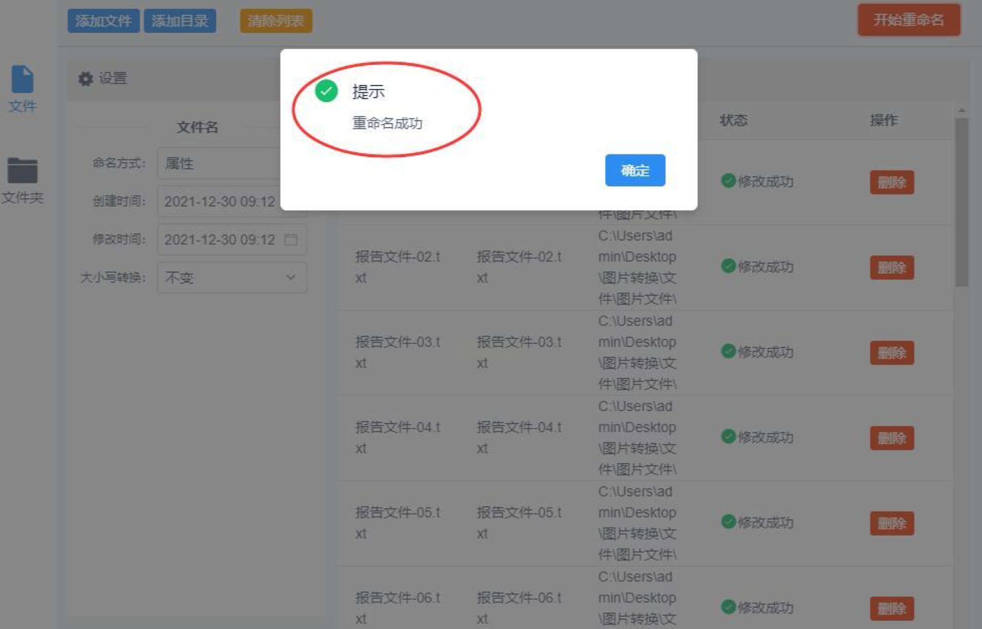 4. 一键启动:点【开始重命名】,等软件跑完,弹出成功提示就OK了!