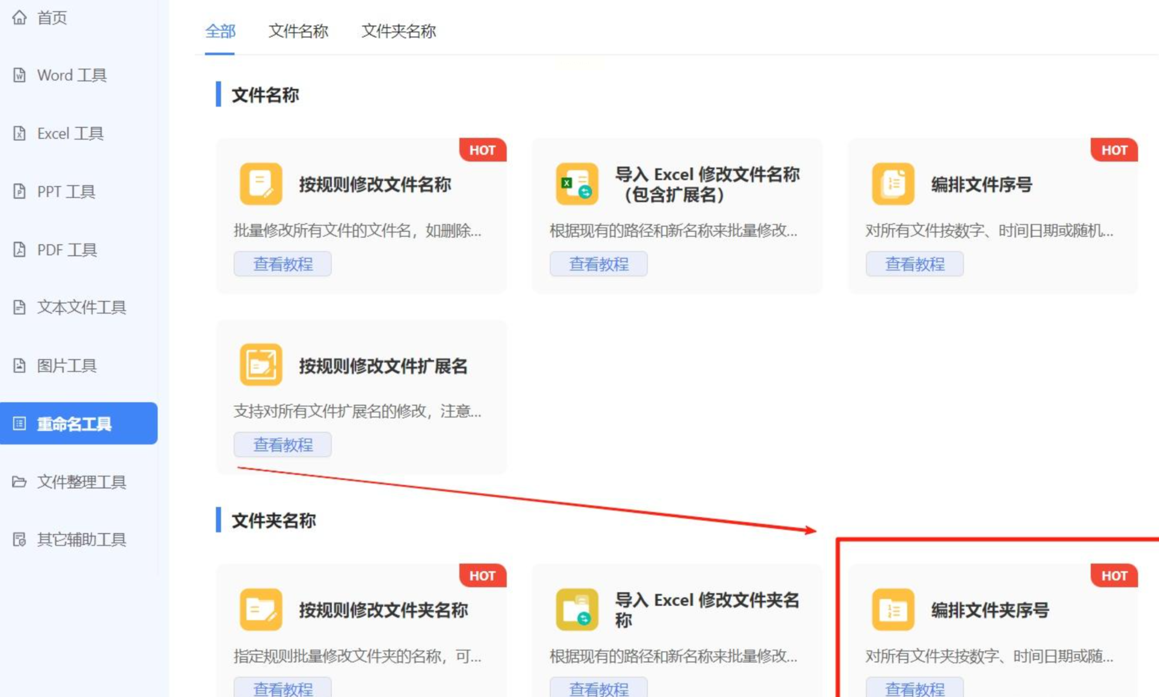 启动「鹰迅批量处理工具箱」,在左侧找到“重命名工具”,然后选择“编排文件夹序号”功能。