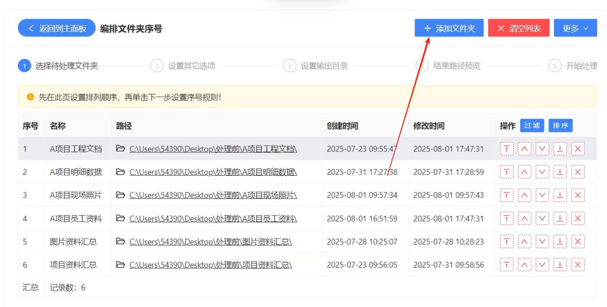 将所有需要编号的文件夹添加到软件列表中。你可以通过上移、下移等按钮调整它们的顺序,最终的编号将按照这个顺序生成。