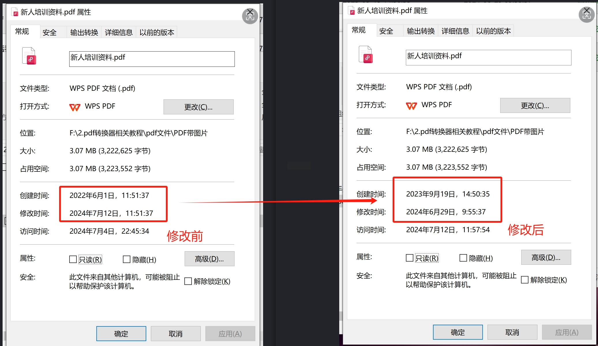 5. 改完后,右键PDF看属性,时间已经变了!
