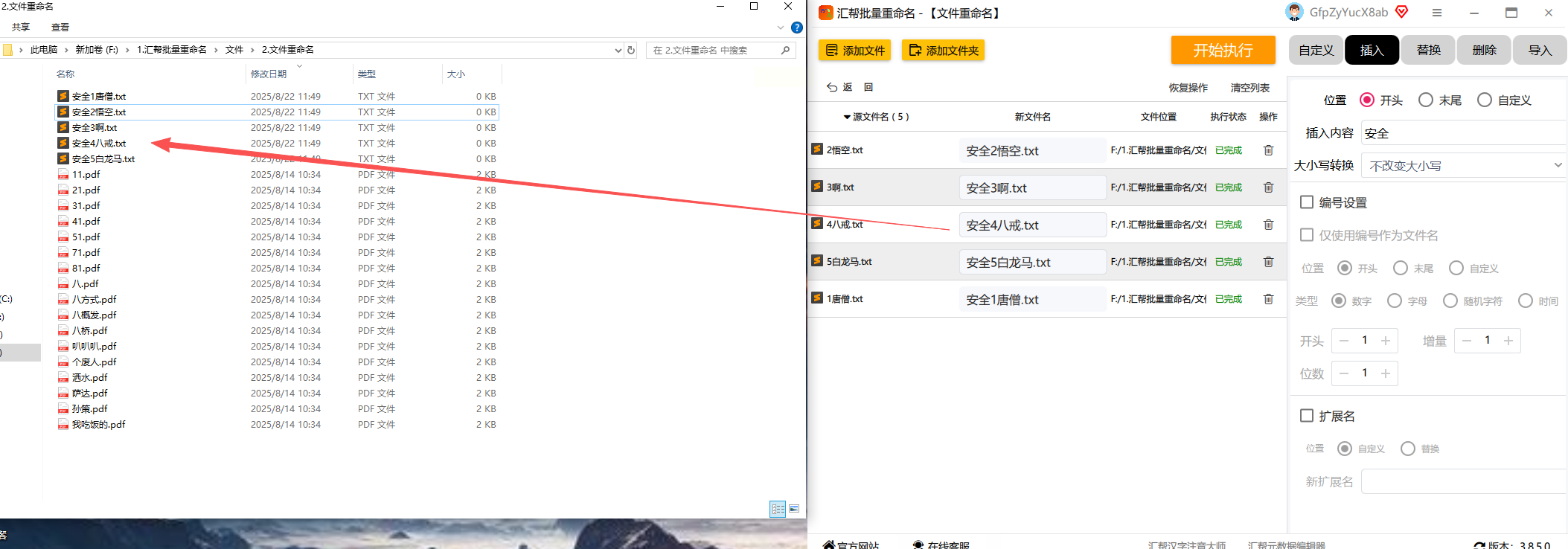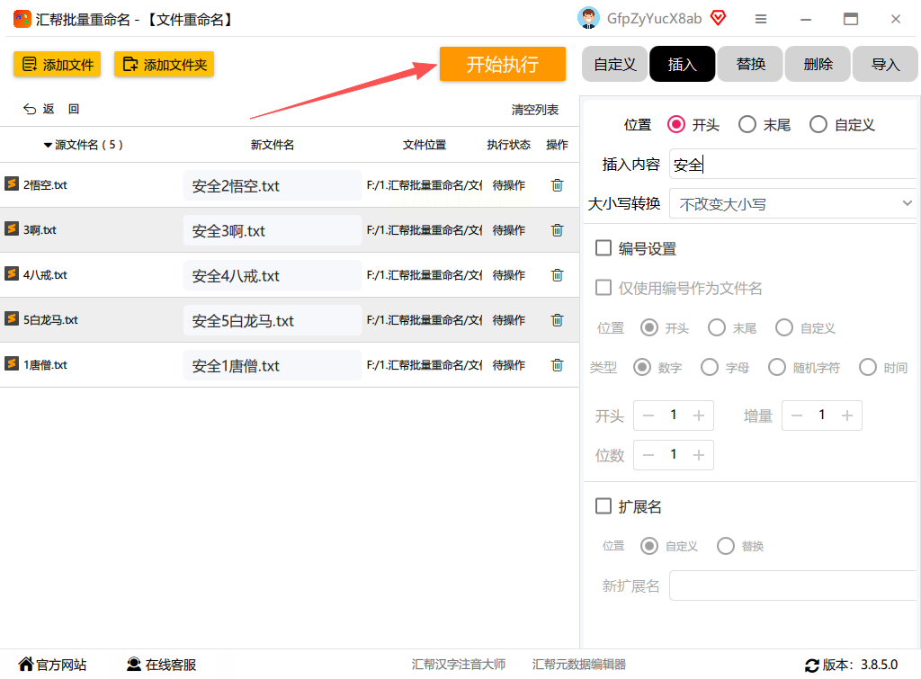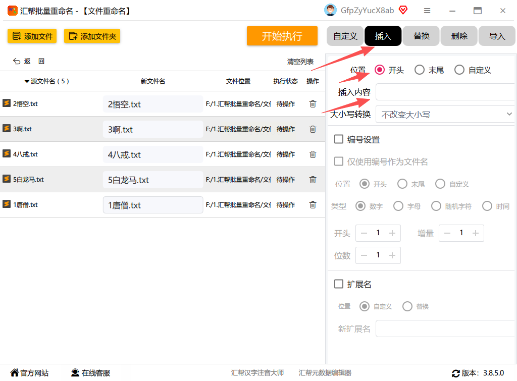 步骤三:文件列表加载好后,注意力移到界面右侧。这里有一个“插入”操作的选项,点击它。然后,在位置设置里,选择“开头”。紧接着,在旁边的输入框中,键入你想添加的前缀文字,比如“项目A_”或者“20231001_”。