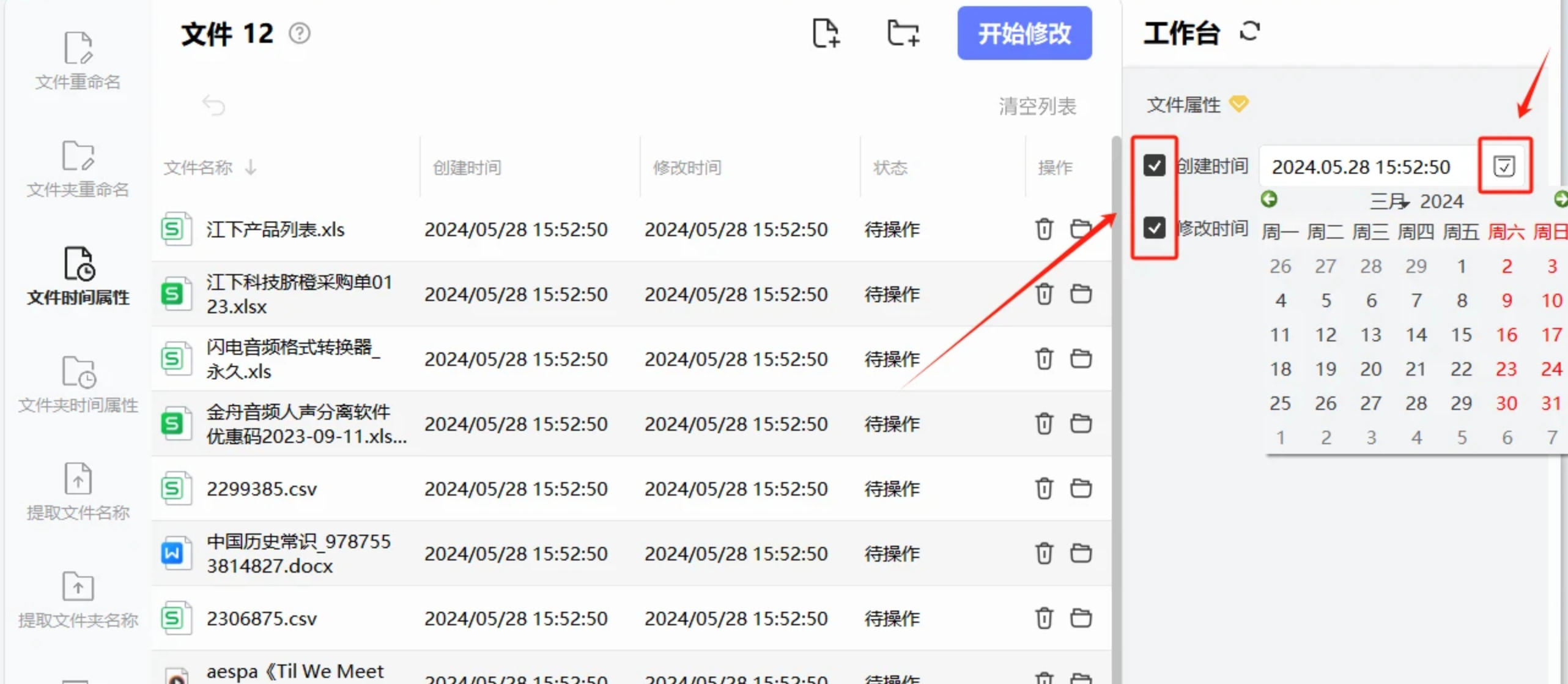 在界面右侧勾选“创建时间”和“修改时间”复选框,点击“日历”按钮: