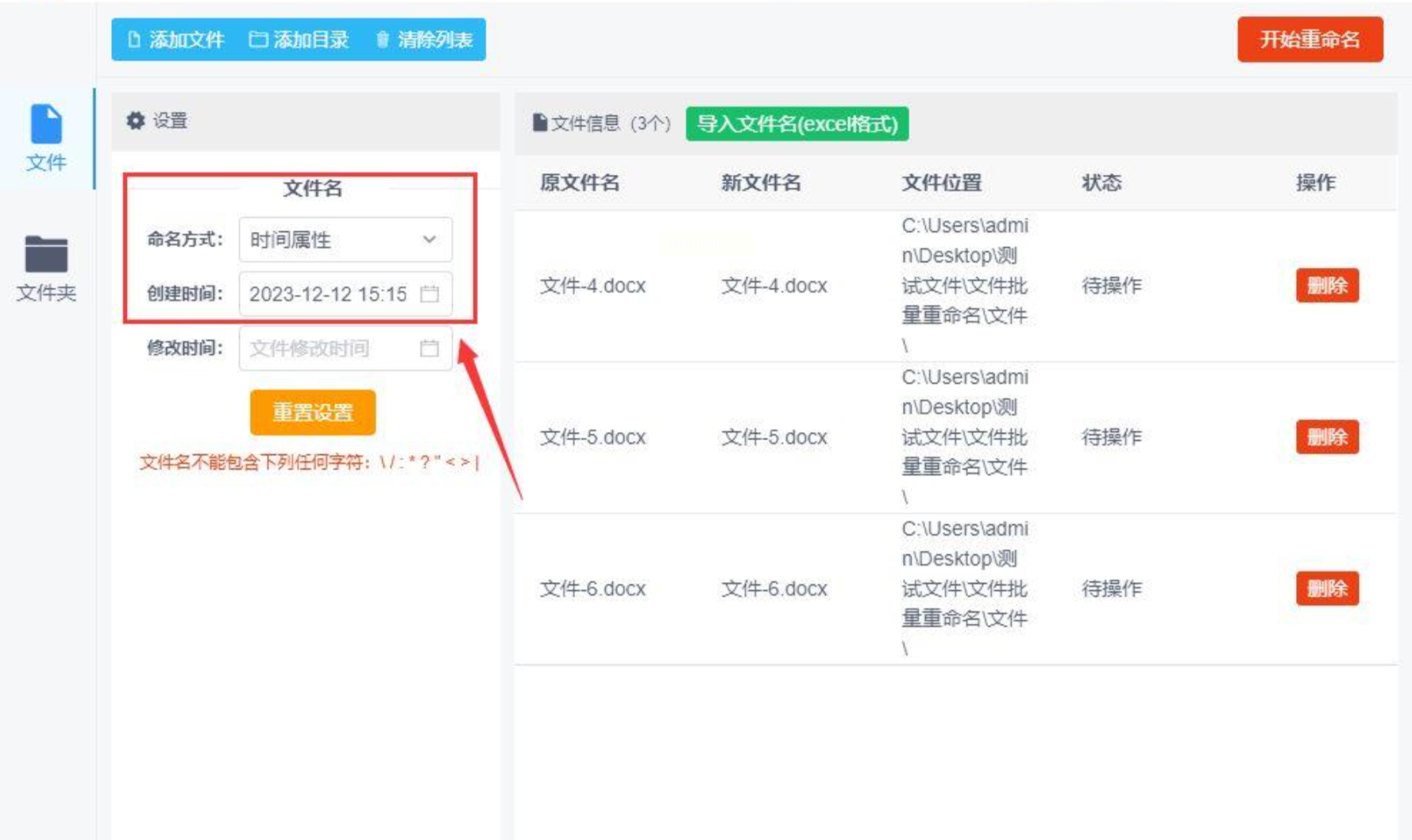 安装完成后,点击“文件重命名”功能模块,选择“时间属性修改”子选项。界面分为左侧文件列表区和右侧设置区,布局清晰直观。
