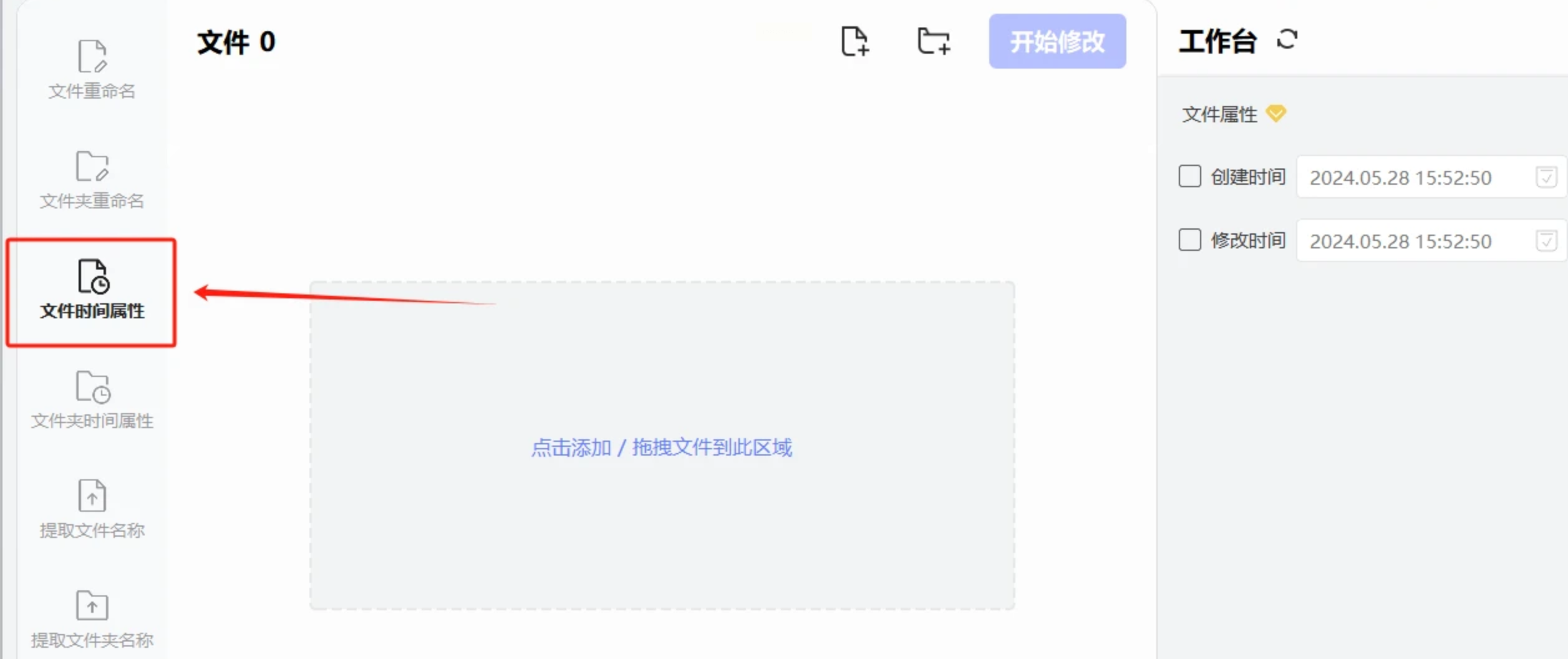 打开软件后,在主界面左侧功能栏选择“文件属性修改”。首次使用需授权软件访问系统文件权限,这是修改时间戳的必要条件。