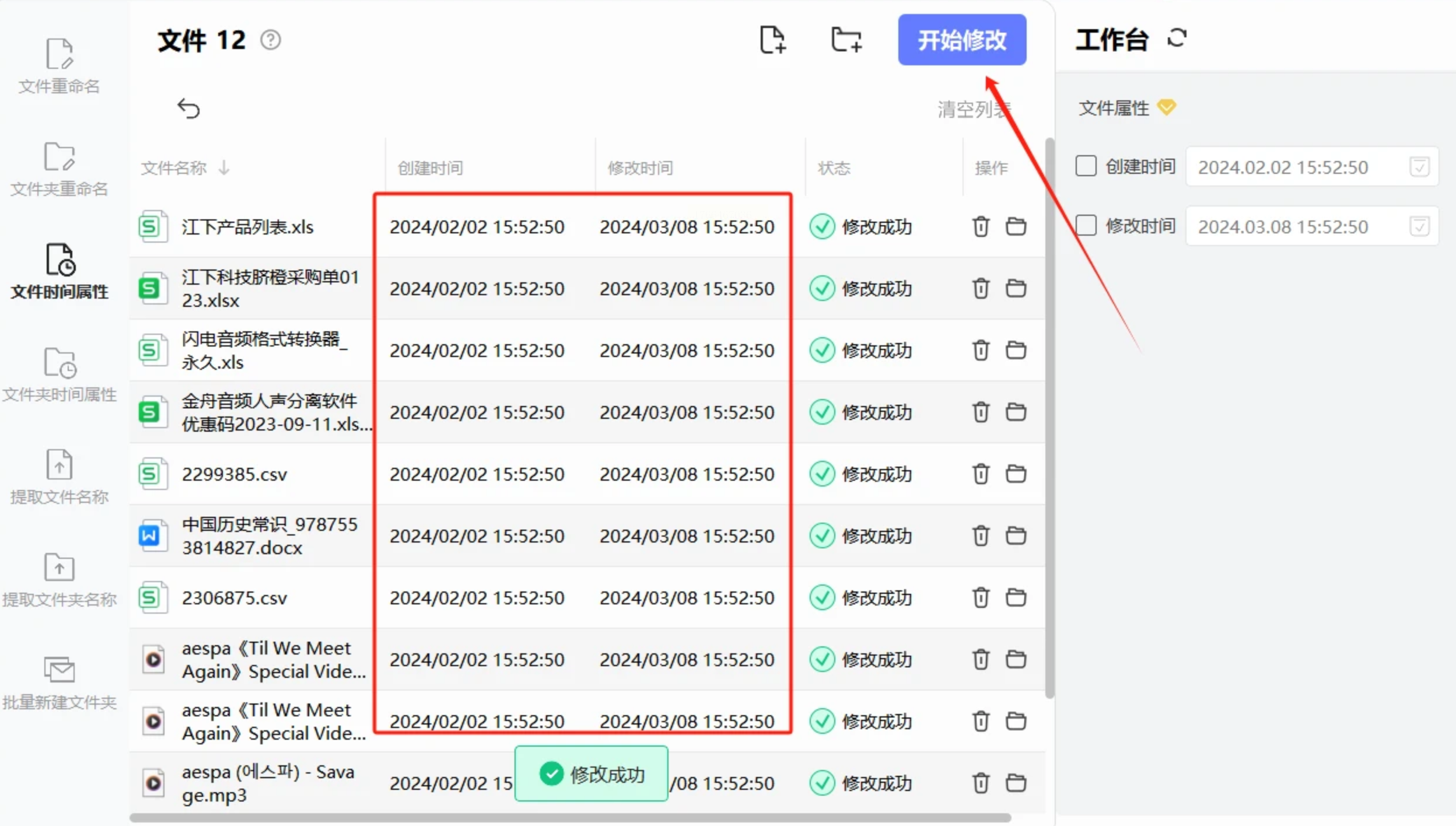 点击“开始修改”按钮,软件会在状态栏显示实时进度。修改完成后,右键文件查看属性,可看到创建时间和修改时间已同步更新。