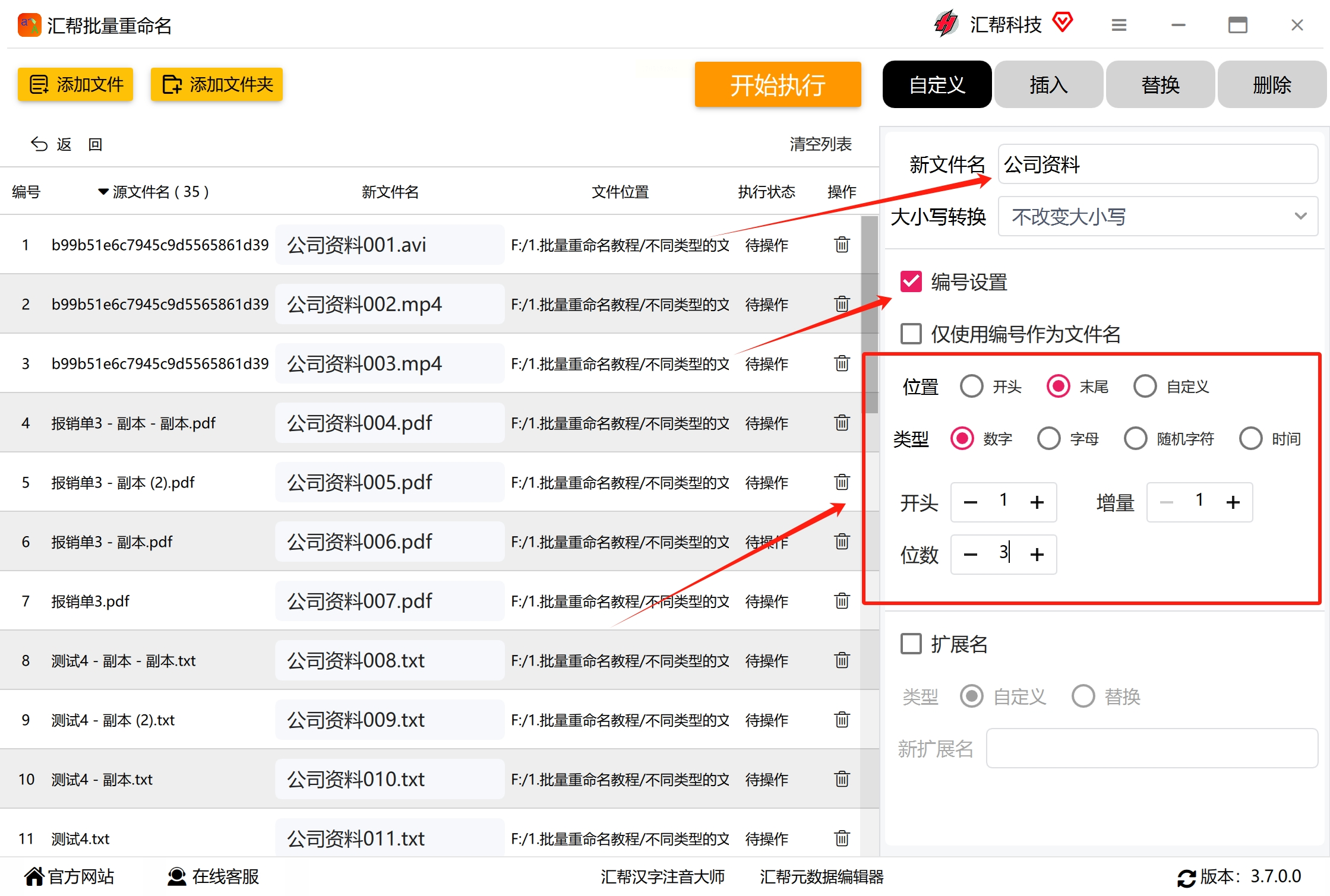 * 位置:编号是放在原文件名前面、后面,还是直接替换掉原文件名?根据你的需要选。