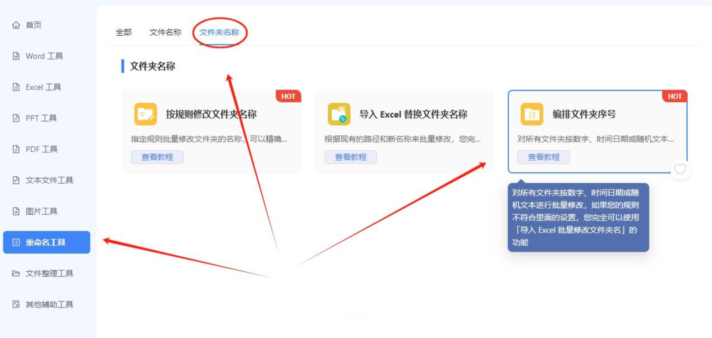 打开「鹰迅批量处理工具箱」软件。在软件左侧的功能导航栏里,找到并点击 “重命名工具”。然后在右侧展示的具体功能中,选择 “编排文件夹序号”。这个功能是专门为整理文件夹设计的,当然也能处理文件。