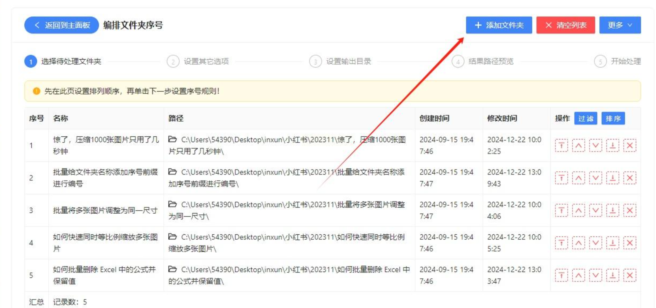 这里有个很实用的功能:文件导入后,会在软件中间形成一个列表。你可以利用列表右侧的 “上移”、“下移”、“置顶”、“置底” 等按钮,手动调整文件夹的先后顺序。软件最终会严格按照你这个列表的顺序来添加编号,这样你就能完全掌控编号的次序了。