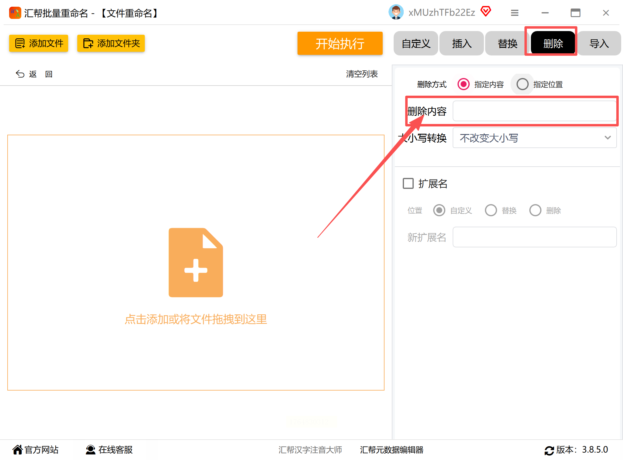 步骤三:在功能选项中,找到“删除”或“移除”相关设置。选择“删除指定内容”模式,并在旁边的文本框内,准确输入你想要从所有文件名中去掉的那段文字。