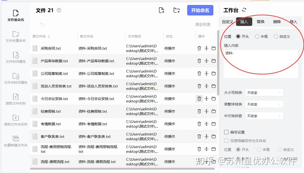 步骤二:在「重命名规则」中选择「插入文本」,位置设为“开始”,输入前缀内容(如“设计稿_”),可同时设置编号、日期等动态参数。