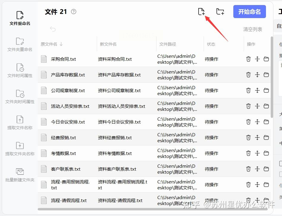 步骤一:选择「文件重命名」模块后,点击右上角「添加文件」按钮,支持批量导入(最多无限制),软件会自动识别文件类型。