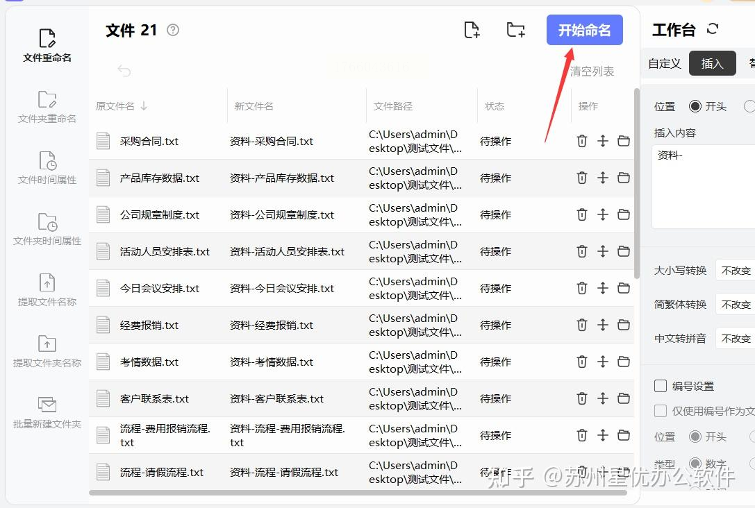 步骤四:勾选「模拟执行」先测试效果,确认无误后点击「开始」,软件会显示每个文件的处理状态(成功/失败),方便追踪问题。