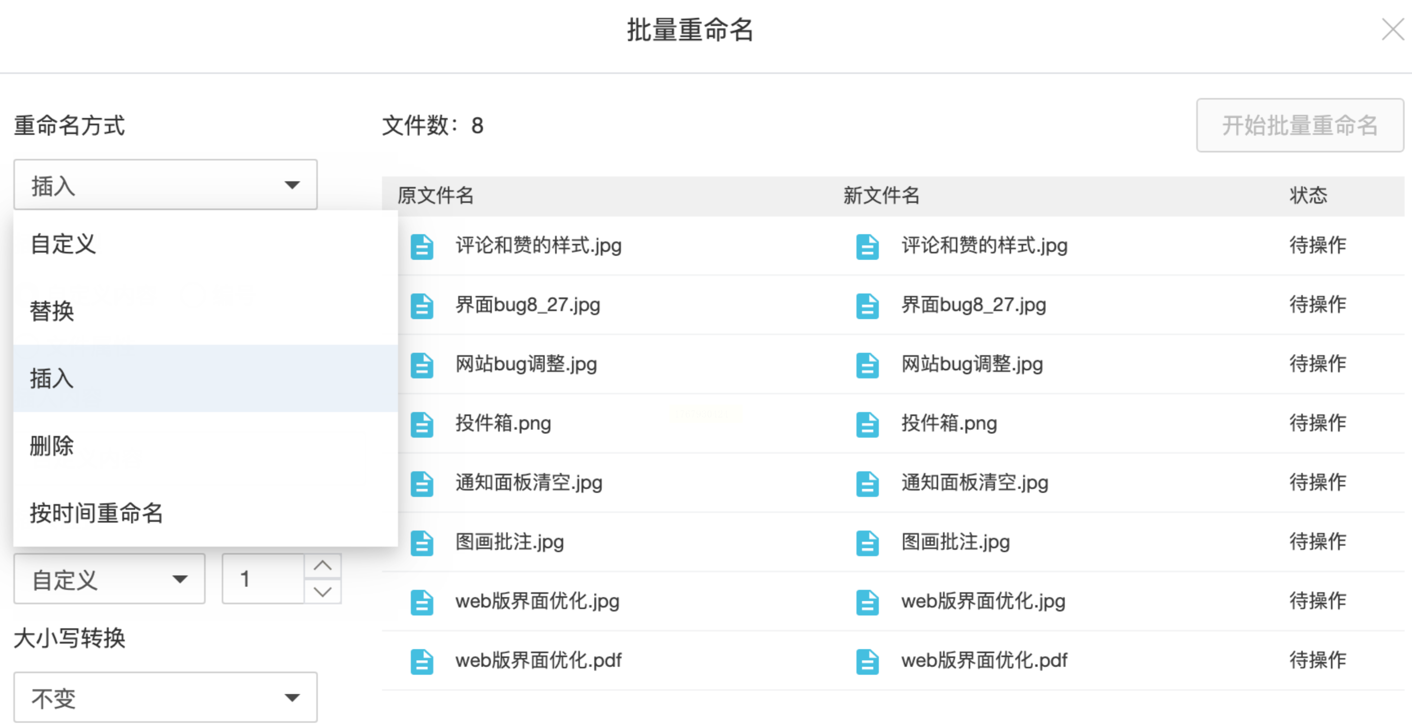 - 插入/替换:选择在文件名中间插入特定内容(如"第X版")
