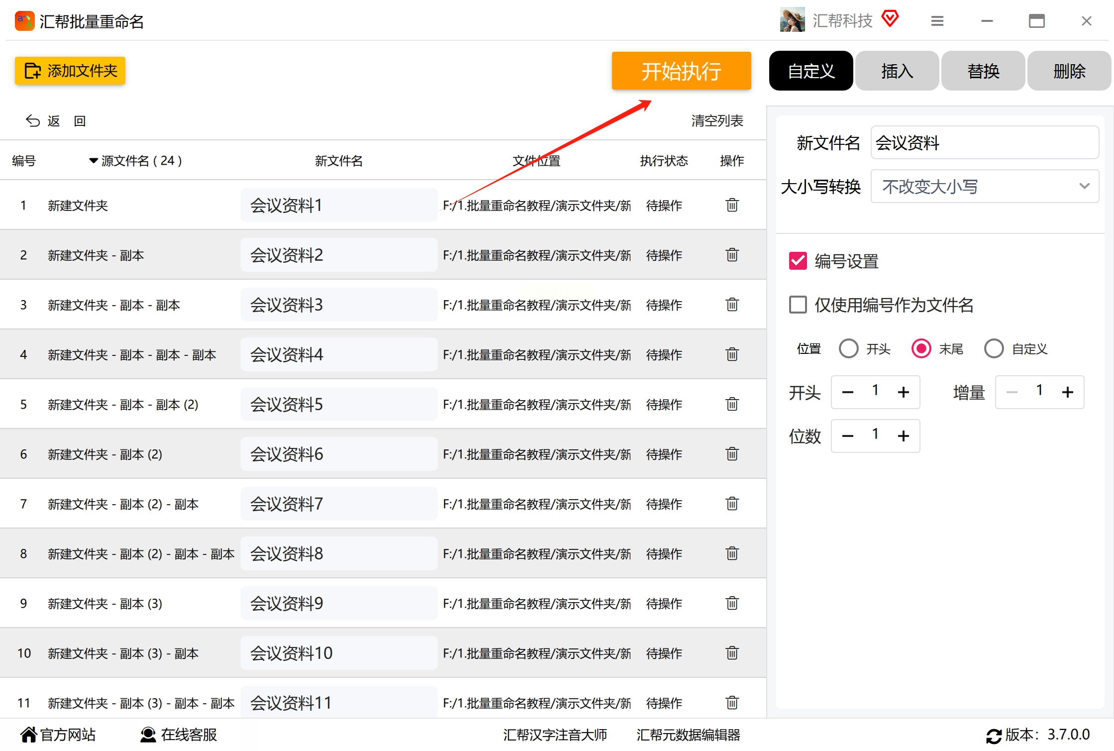 设置好后,别急着动手。先看看软件左侧的列表,那里会实时预览新文件夹名是什么样子。确认一遍,没问题,和你想象中一模一样。好了,深吸一口气,点击那个充满仪式感的 【开始执行】 按钮。
