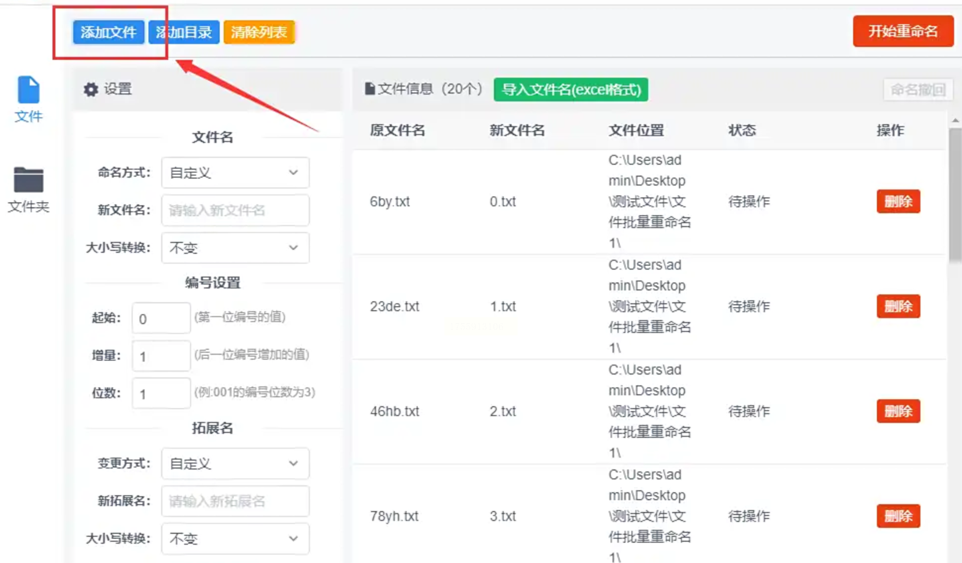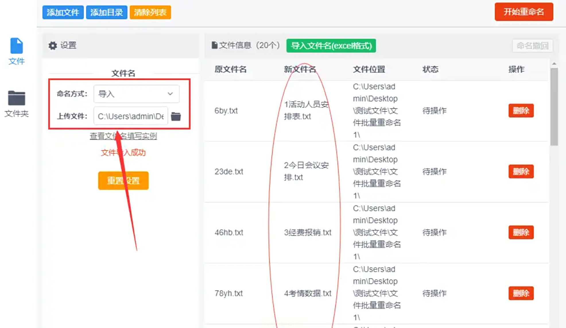 点击“导入Excel表格”按钮,从电脑中找到你准备好的Excel文件(同样要求第一列是目标文件名)。导入后,软件会自动把Excel中的名称填充到“新文件名”列中。