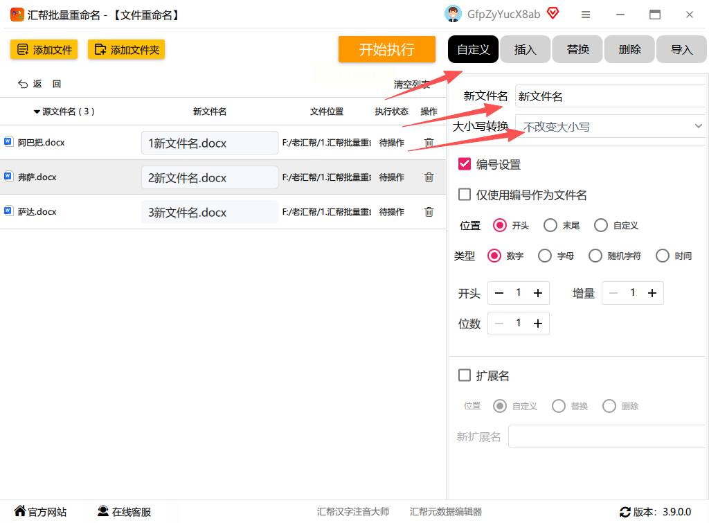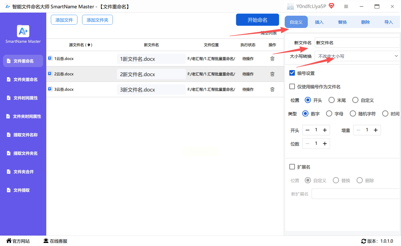 3. 设置命名规则:在右侧设置区域,选择"自定义"模式,输入新的文件名模板。例如,若要按序号重命名,可输入"项目方案-张三-{{序号}}",其中{{序号}}会自动生成从1开始的数字序列,轻松实现批量更改word名为不同名字。