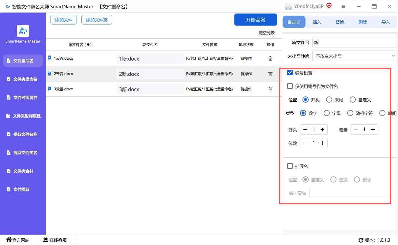 4. 设置序号起始值:如需按序号重命名,设置起始数字和步长(默认为1),方便批量更改word名为不同名字。