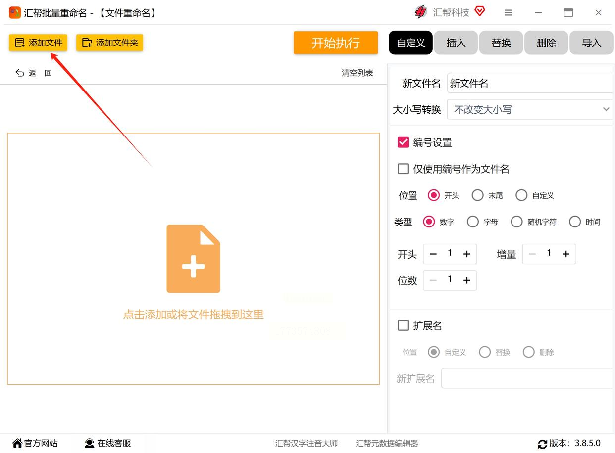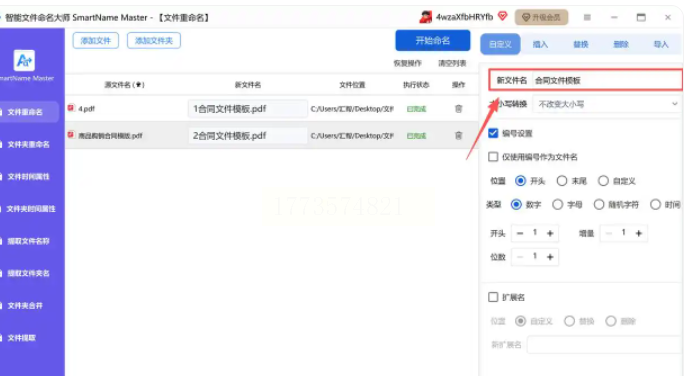 - 添加编号功能:在下方找到“编号”设置区域,可设置起始数字(如从1开始)、编号位数(如3位显示为001、002),以及编号位置(前置或后置)。设置过程中,左侧文件列表会实时显示修改后的预览效果,方便你随时调整。