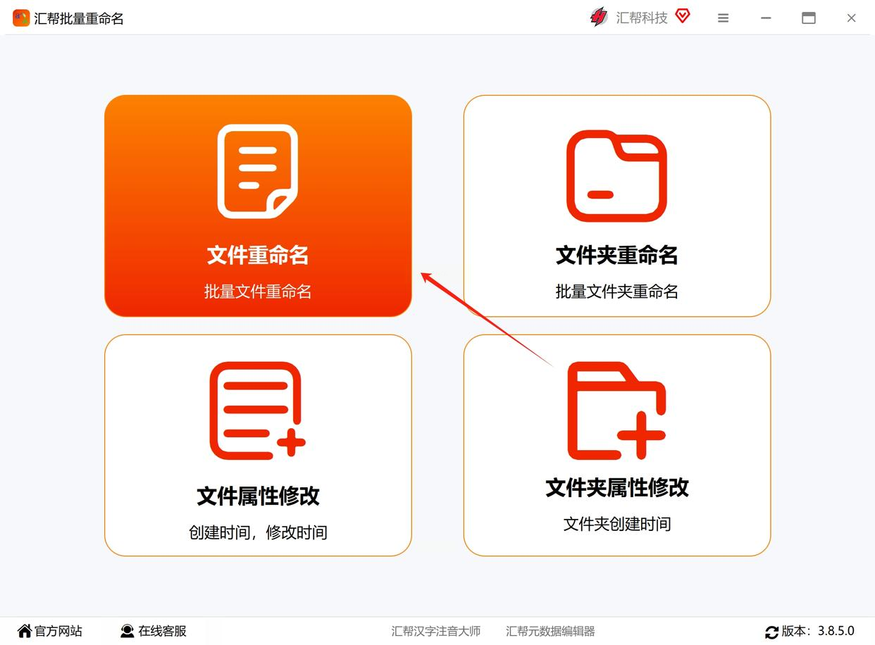 首先在官网下载汇帮批量重命名软件并完成安装。打开软件后,在主界面左侧找到“文件重命名”选项,点击进入操作界面。