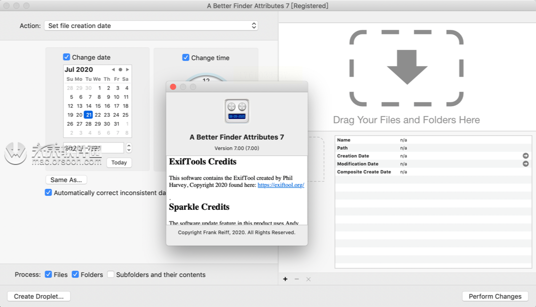 专为Mac系统设计,可同步修改文件创建时间和图片EXIF数据。打开工具导入文件,在时间设置面板调整参数,点击应用按钮后通过Finder验证结果。
