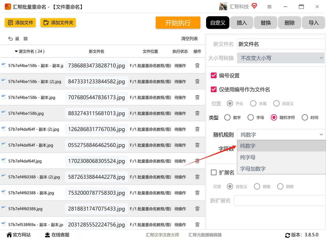 - 在"文件名类型"中选择"随机字符",这里可以根据需求选择: