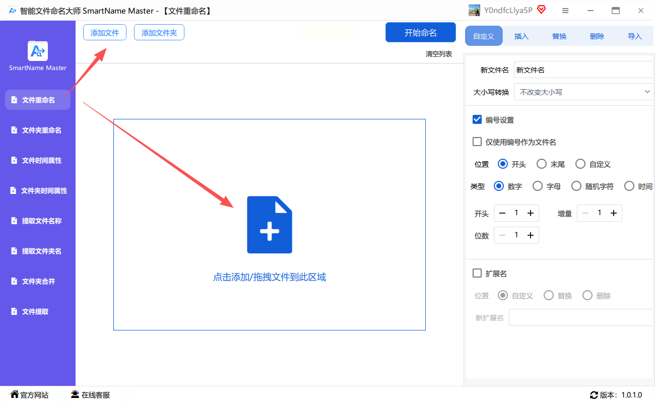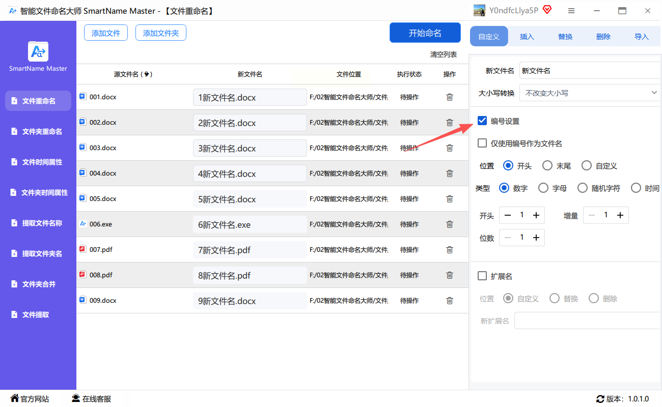 2. 上传文件后,右侧“自定义命名”里选“编号设置”,选“前缀+数字”模式;
