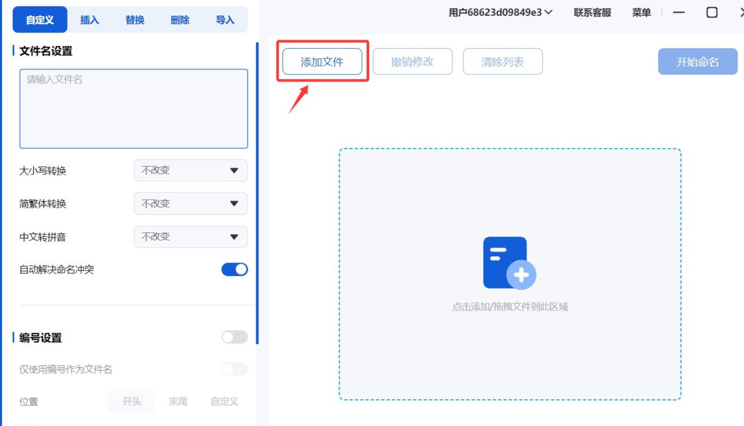 2. 添加文件:点击左上角【添加文件】,可以直接把文件拖进软件窗口,支持文件夹批量导入(比如你想给整个文件夹的照片编号,直接拖文件夹就行)