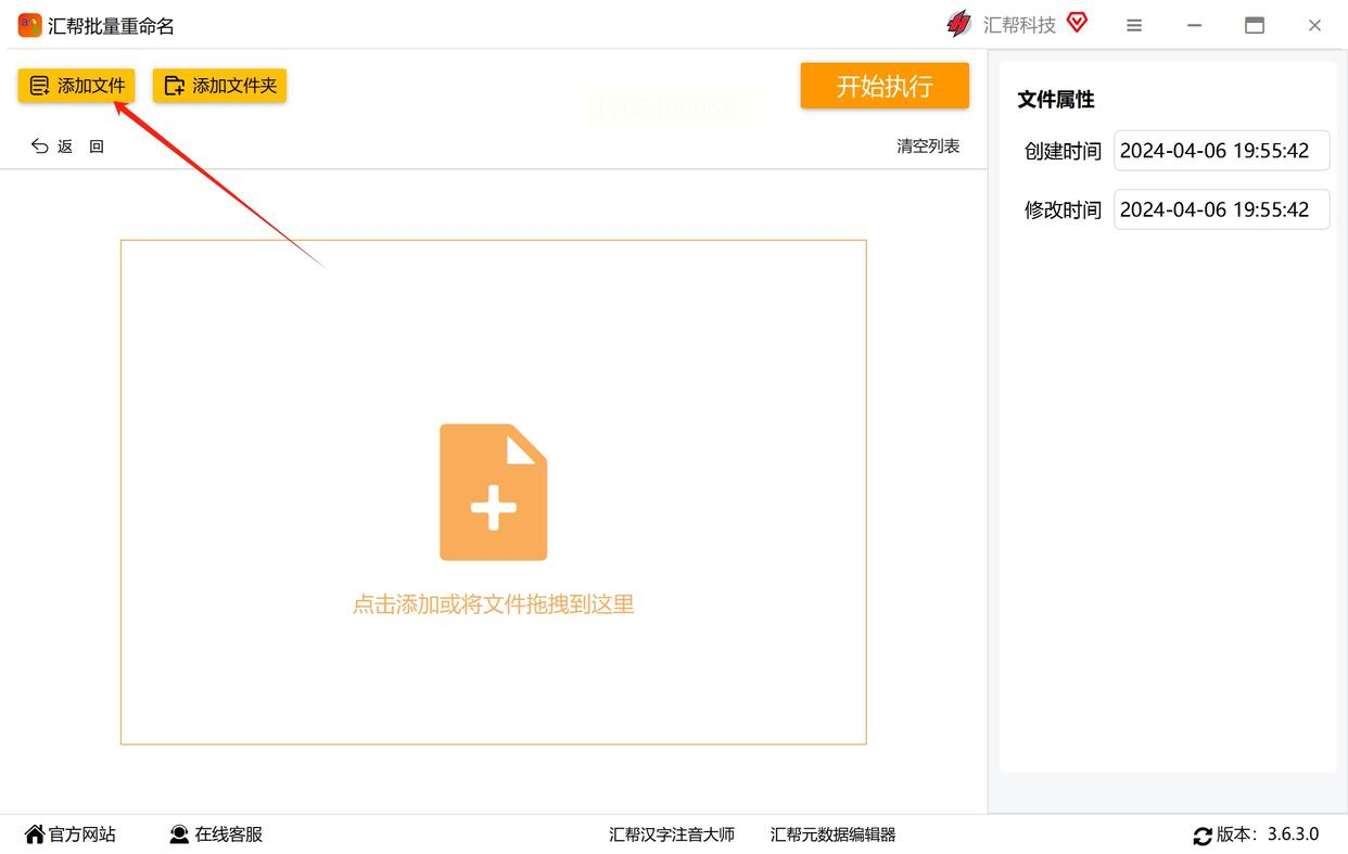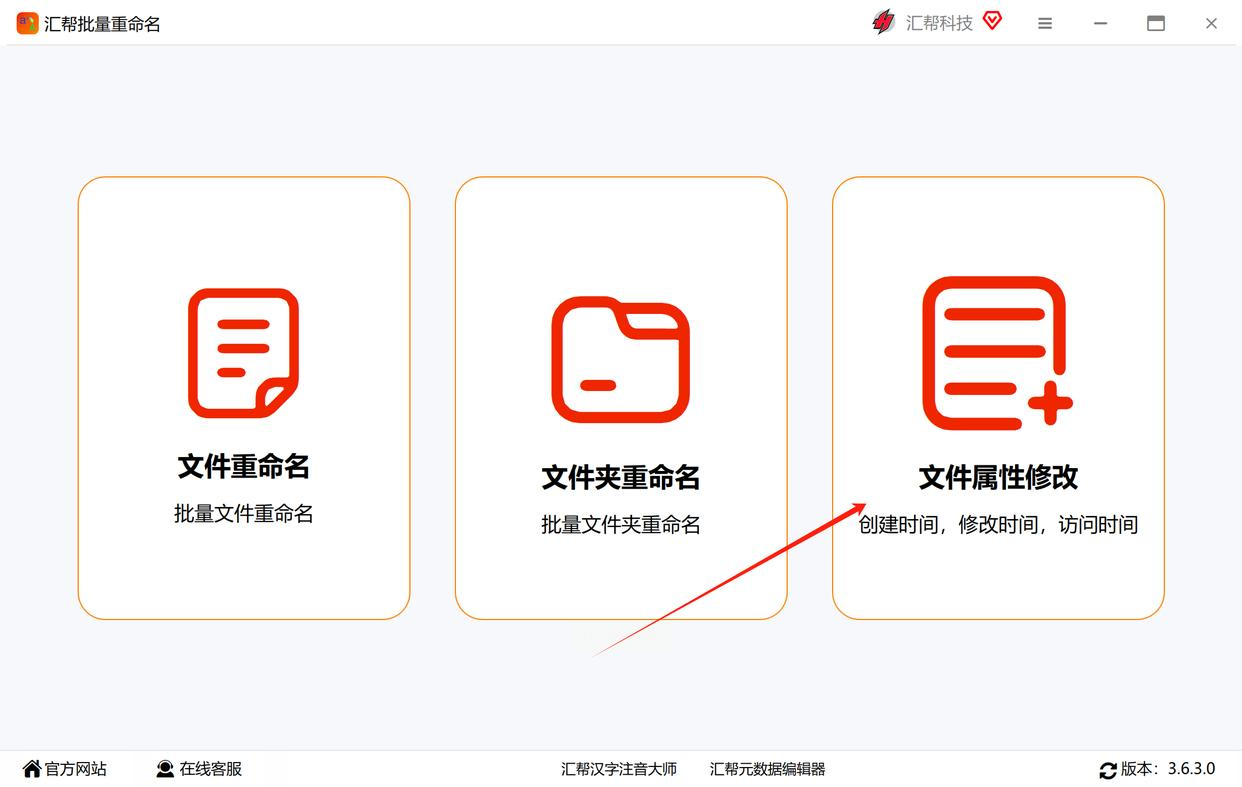 首先,你需要去软件的官网或其他可信的下载站,找到“汇帮批量重命名”这款软件,把它下载并安装到你的电脑上。安装完成后打开它,在主界面上,你会看到好几个功能选项,我们这里需要点击 【文件属性修改】 这个按钮。