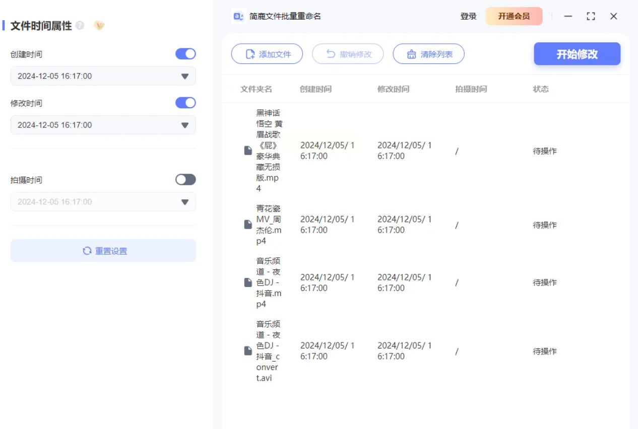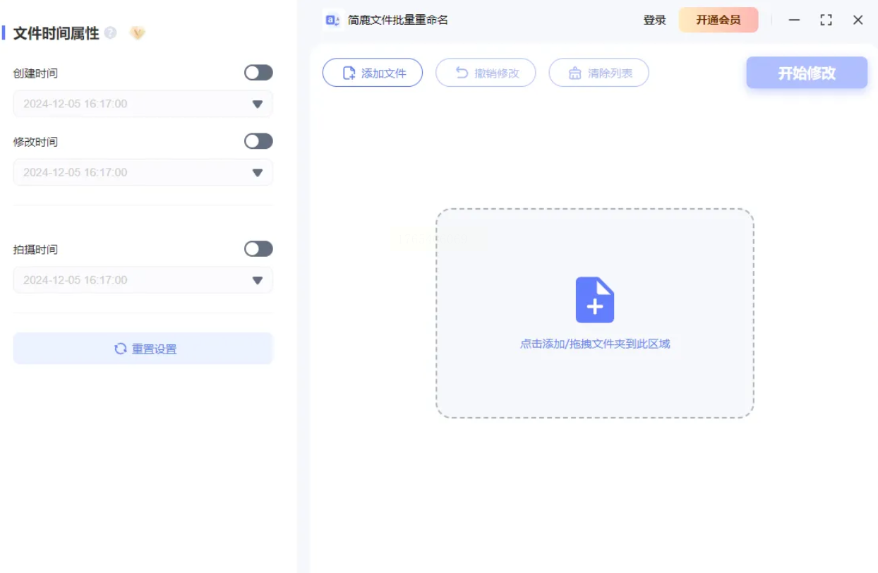 打开“简鹿文件批量重命名”软件后,你会看到顶部或侧边有多个功能标签页,比如“重命名”、“属性修改”等。我们需要找到并点击 【文件时间属性】 或类似名称的选项,进入专门的设置页面。