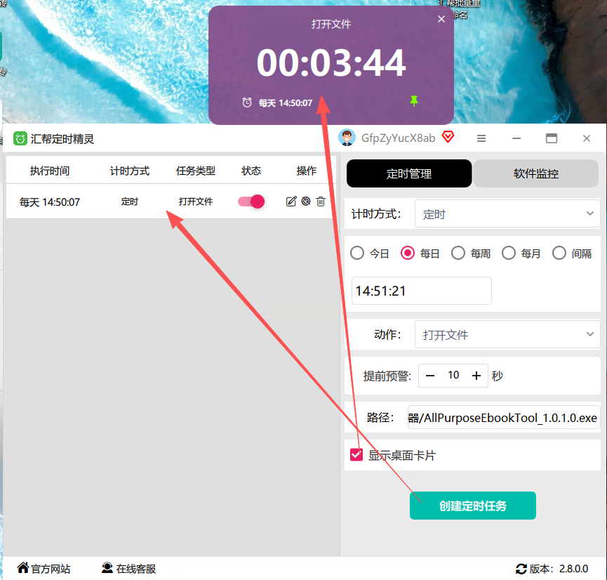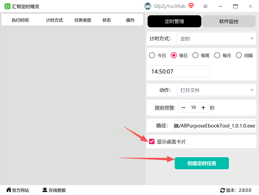 5. 添加桌面卡片:勾选"显示桌面卡片",这样任务执行时会在桌面弹出小窗口提醒,防止错过自动打开软件的时机。