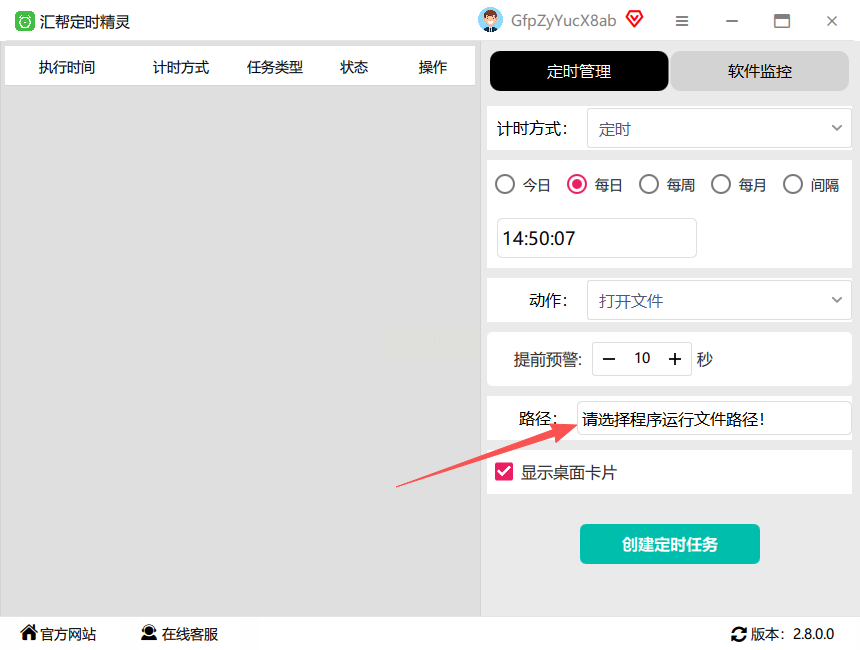 1. 软件没自动启动?先检查路径是否正确(比如选到文件夹而不是.exe文件),汇帮定时精灵要确认"开机自启"开关没关,确保自动打开软件正常执行。