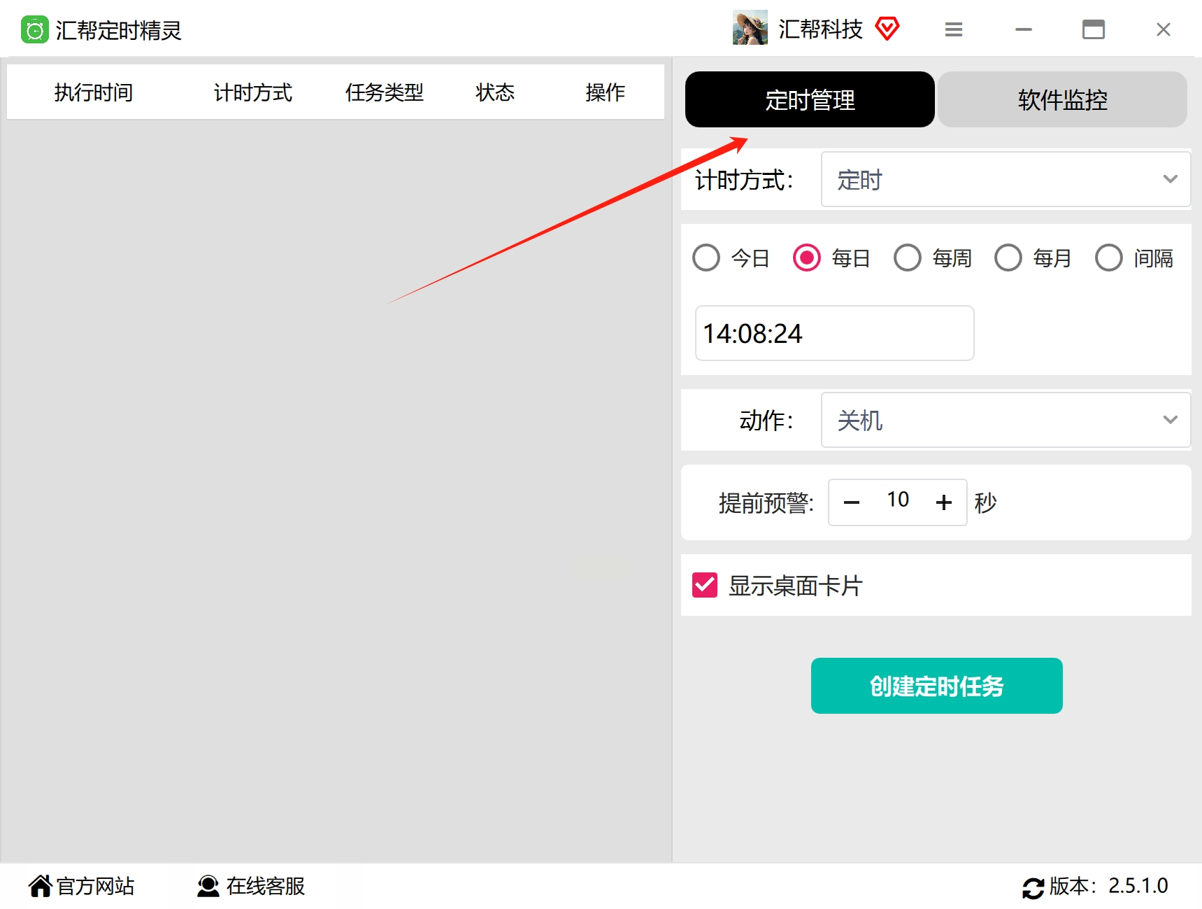 打开汇帮定时精灵,在主界面左侧导航栏点击"定时管理",界面右侧会显示"定时任务"与"提醒事项"两个选项卡,选择"定时任务"。