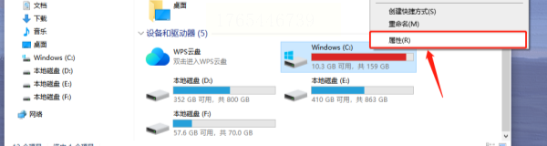 2. 召唤属性窗口: 把鼠标移到C盘图标上,点击右键,在弹出的菜单里,找到并选择最下面的 “属性”。