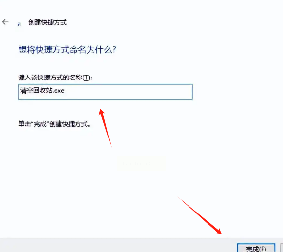 点“下一步”,给这个快捷方式起个名字,比如“秒清回收站”。再点“完成”,桌面上就会出现一个新图标。以后只要双击它,回收站瞬间就干净了,连确认框都不会弹。