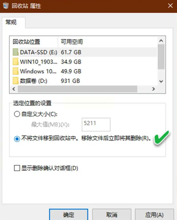 这么设置之后,你按Delete删除文件时,就不会有“是否放入回收站”的提示了,文件直接永久删除。好处是随时释放空间,坏处是一旦删错就很难找回。除非你对自己的操作很有信心,或者有另外的文件备份习惯,否则慎用。