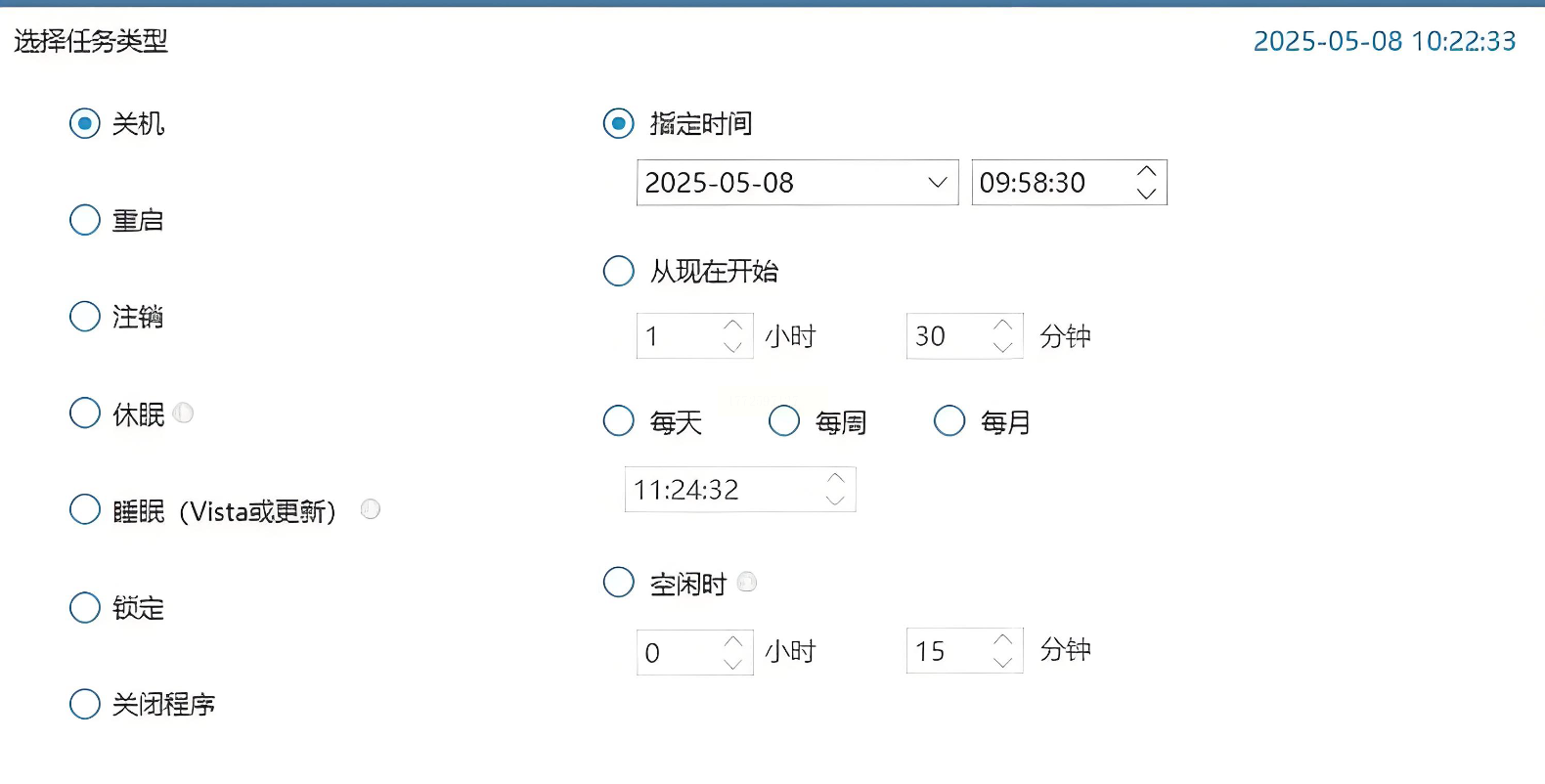 然后选“每天”或“一次性”(比如今晚10点关机选“一次性”,每天10点选“每天”)。